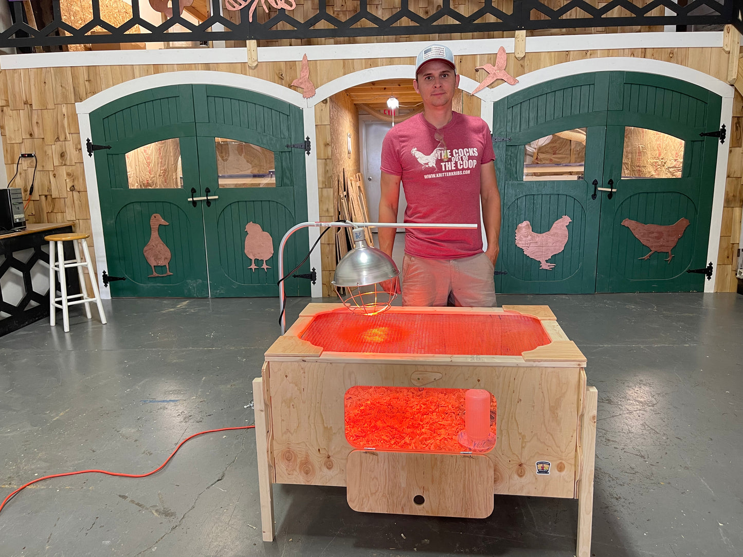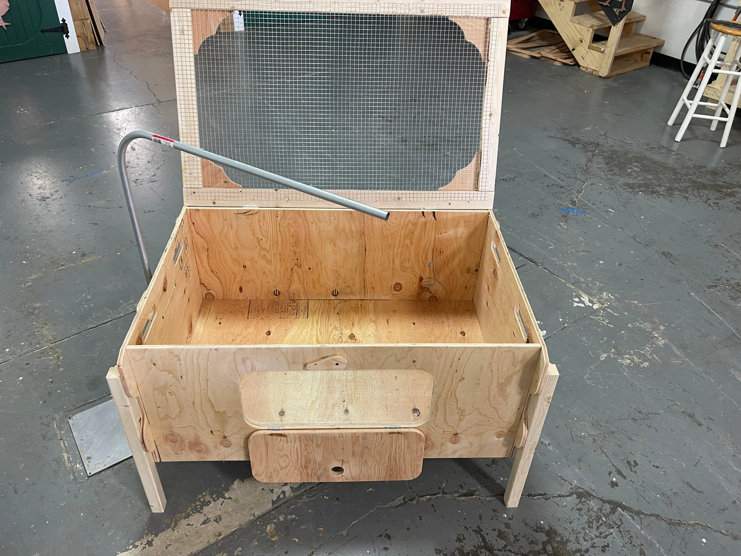 Ben's E-Z Brooder is a compact and portable wooden enclosure designed to provide a safe and nurturing environment for raising chicks. Crafted from high-quality wood, this brooder offers a cozy and secure space for young birds to thrive. With its large size it can double as a chicken hospital for injured full sized birds that need a space separate from the flock. The brooder features a lifting wire mesh lid and front mesh viewing window, allowing easy access for feeding, cleaning, and monitoring the chicks' progress. It also includes a built-in pole holder for the brooder lamb. Ben's E-Z Brooder is designed by award winning inventor Ben Logan and creator of Kritter Kribs. Ben's EZ Brooder quick to assemble and disassemble for easy storage. This practical design is a user-friendly solution for backyard poultry enthusiasts or small-scale farmers looking to raise healthy and vibrant chicks.