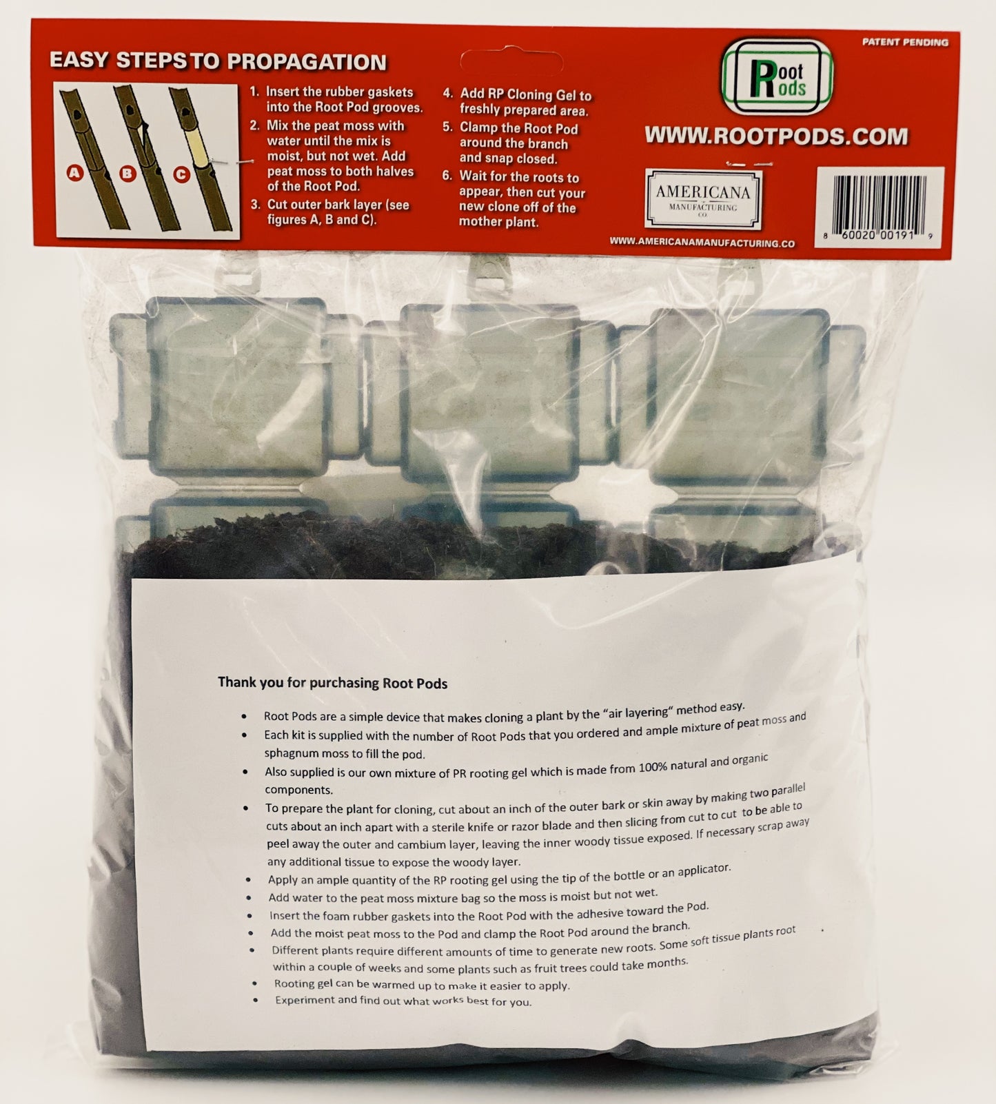 The Gardener's Kit comes with 6 Root Pods, blended peat soil, 30-ml RP Cloning Gel, foam inserts for the 6 pods + (an extra row of foam), and instructions for use.