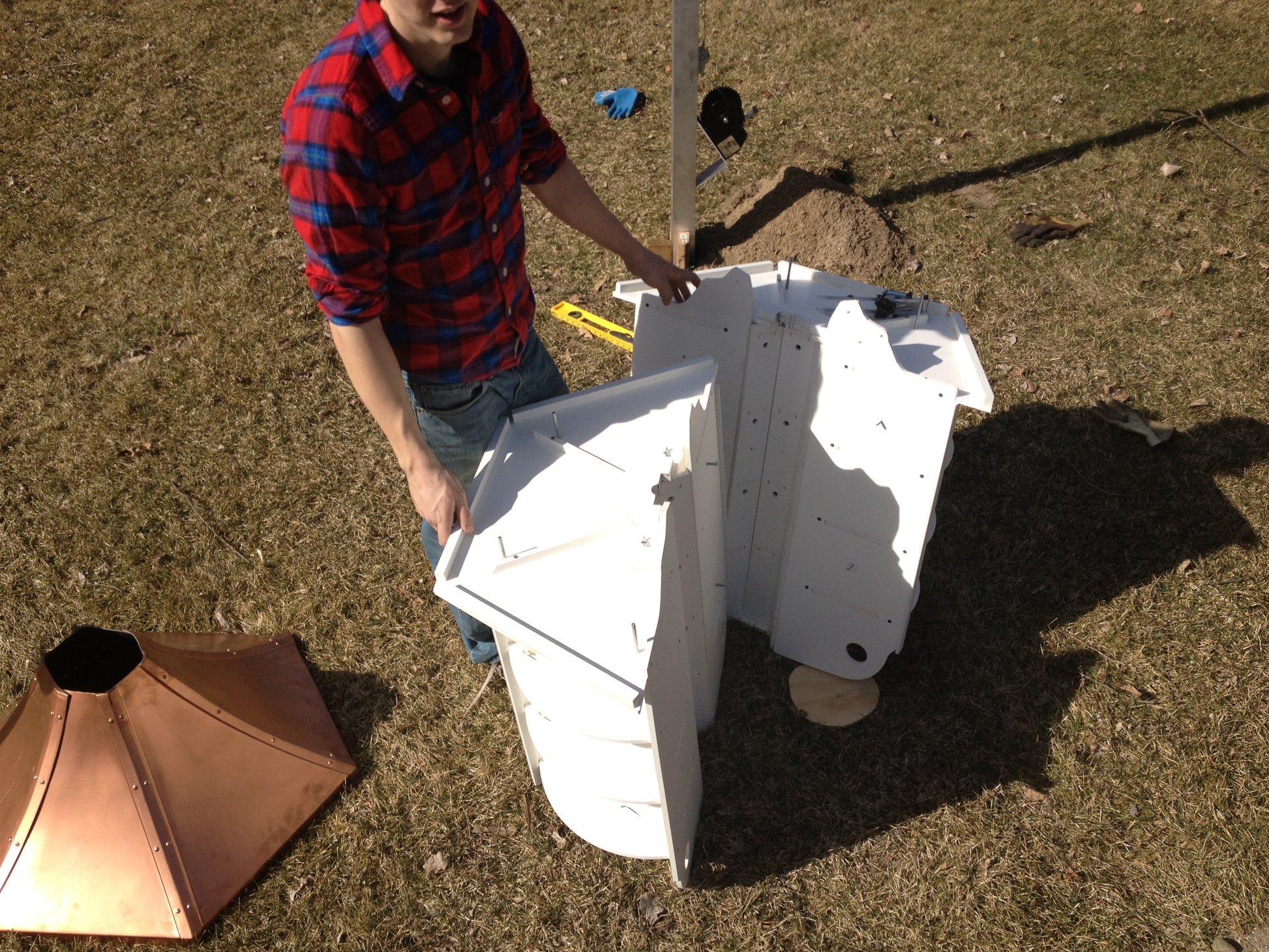 The Logan House is made of PVC sheet, has a fiber glass roof and aluminum hardware. The house is made to last a lifetime. It has 18 large compartments and all the doors open individually. It has starling resistance entry holes, large porches and porch dividers and there are gates on the back of the doors so that the entrances can opened and closed when the landlord desires. The PVC has great insulating properties and never has to be painted. The house moves up and down the pole with a worm drive winch, which can be powered with a cordless drill with a long extension socket, so that the operator is never under the house as it is being raised and lowered. The compartment size is 12" wide 8" deep and 7" tall. The SREH is offset from the center point of the door to provide more protection from driving rains and preditors. I had the house tested by a biologist for the last two years and it has proved to be superior over other martin housing on the market!